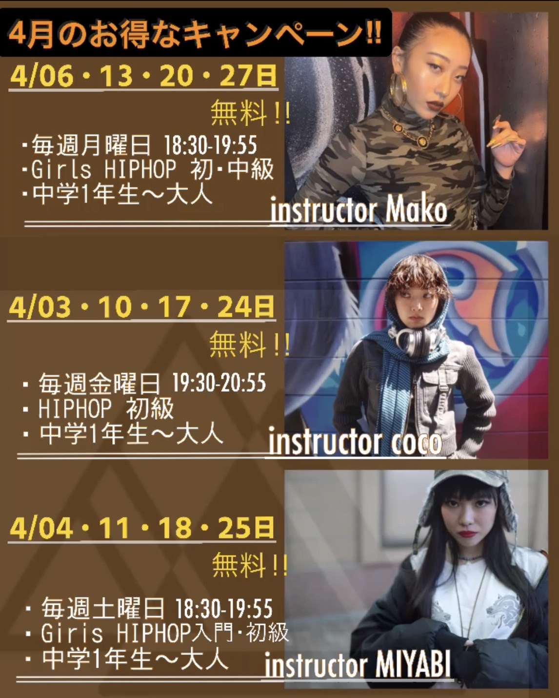 以下のクラスは4月中なら、何回でも無料で受講可能!!